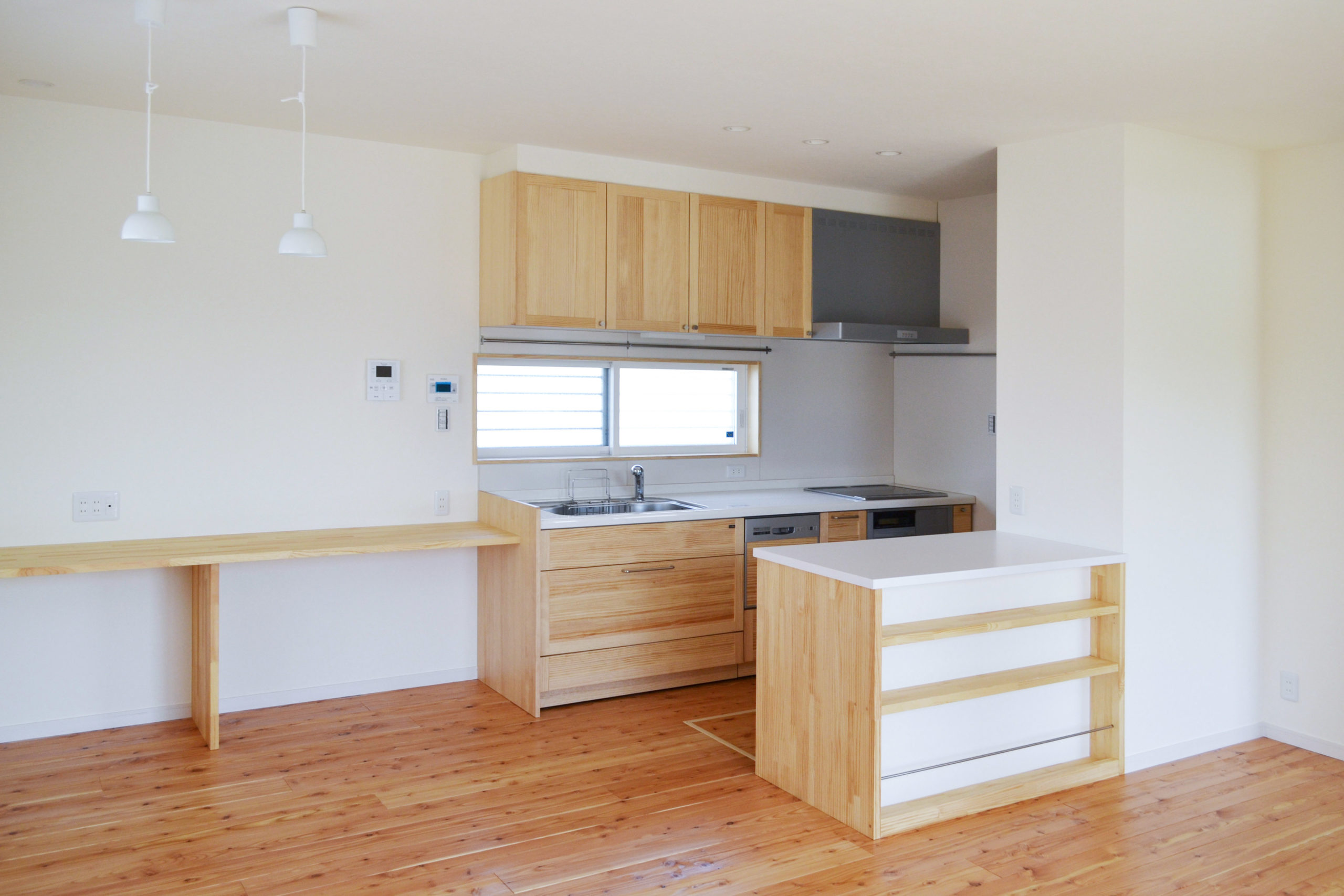 キッチンには奥様のパン作りに欠かせないアイランドテーブルを造作。テーブル下はキッチングッズや家電製品の収納として、また、テーブルの奥行きを活かしてリビング側には雑誌や小物が飾れる棚収納を設けました。