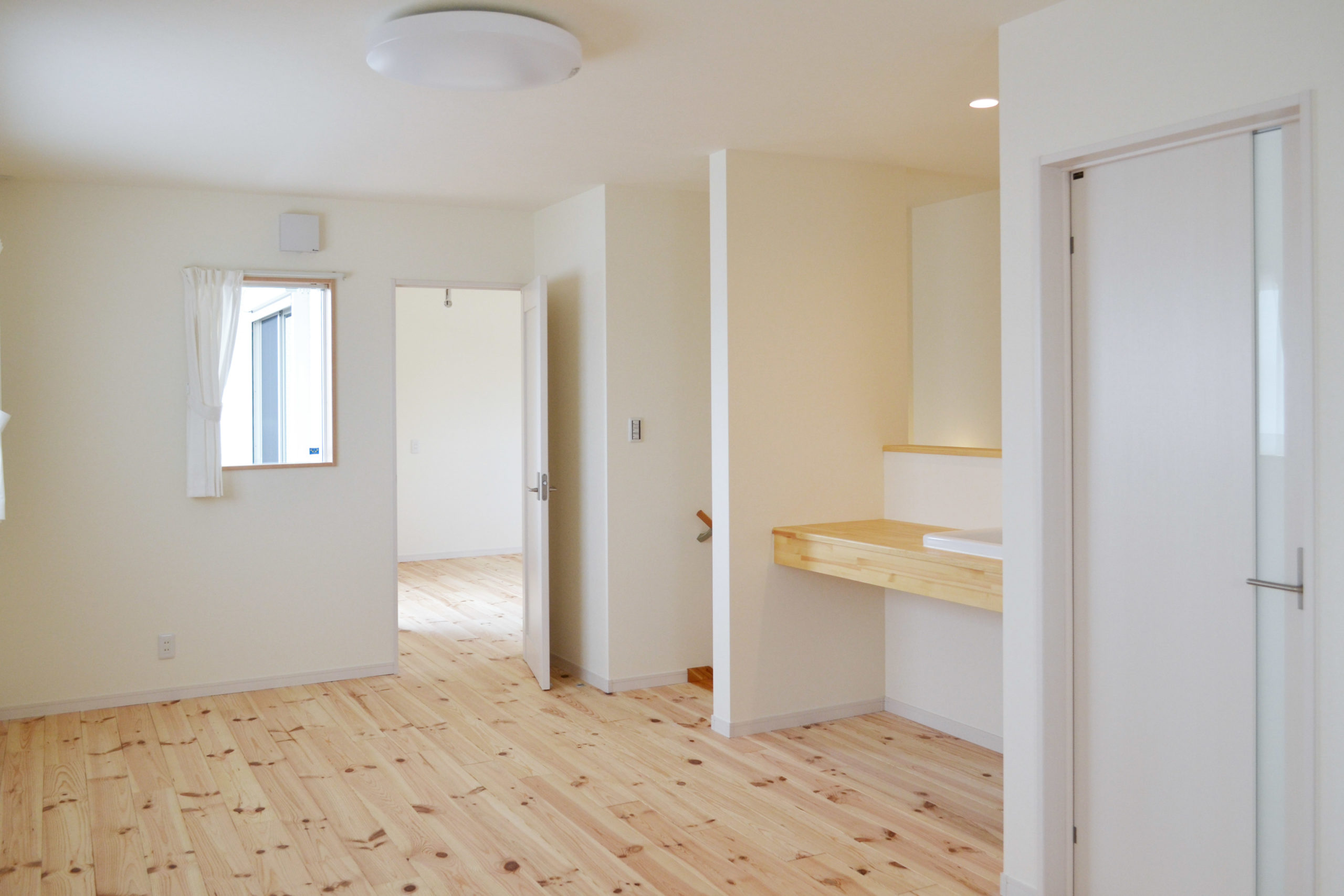 2階ホールはセカンドリビングとしても使える広さを確保。洗面ボールのある大きなカウンターは遊びに趣味に家事にも便利です。