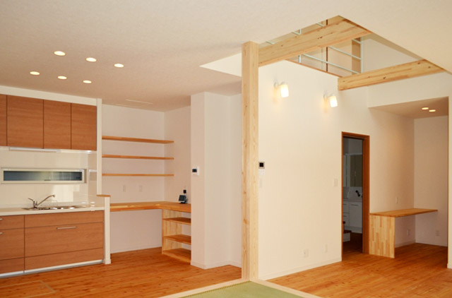 畳コーナーには段差を利用した大容量の収納。大きな吹抜けはリビングに明るい陽射しを届けるだけでなく上下階を結び家族の絆を深めます。
