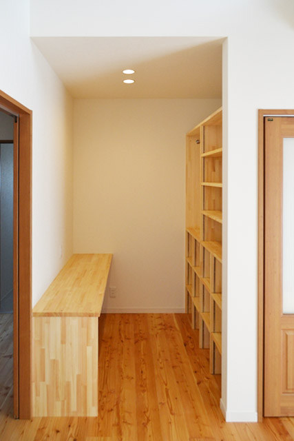 LDKの一角にはみんなでシェアするデスクスペース。子どもたちそれぞれの収納も設置して、学用品もスッキリと片付きます。キッチン横にある奥様の家事コーナーでは、忙しい家事の合間に家族のスケジュール管理もバッチリできます。